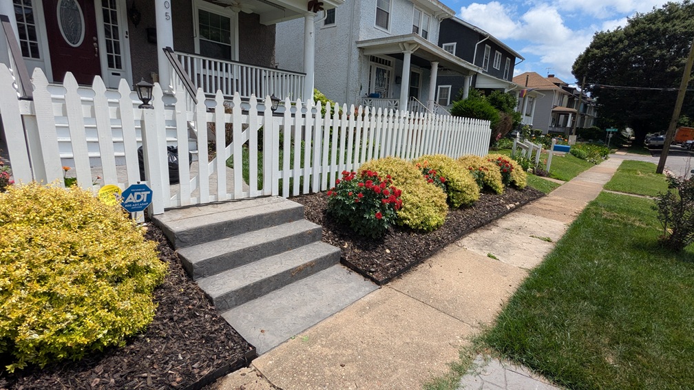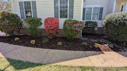 Clean up existing landscaping by removing weeds, pruning trees and shrubs, and removing any dead plants.